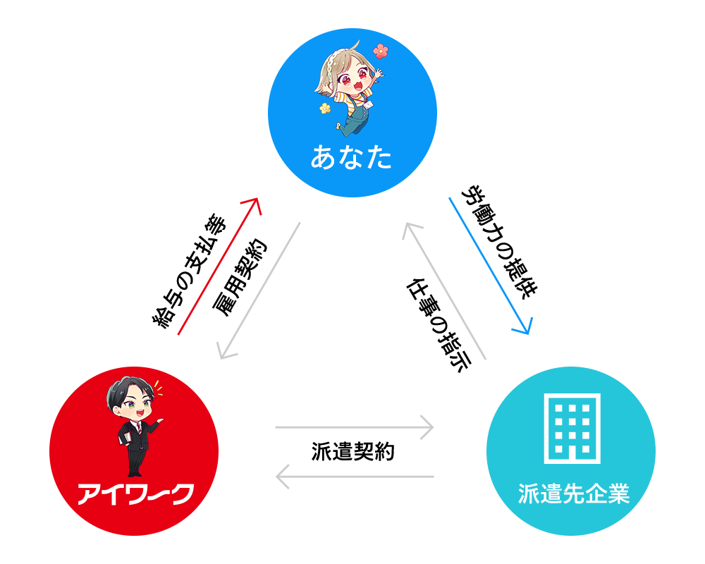 派遣は、派遣スタッフ、アイワーク、派遣先企業の3者の関係で成り立っています。